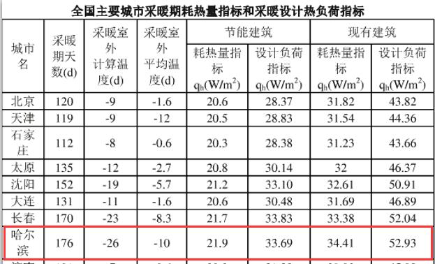 根據《全國主要城市采暖期耗熱量指標和采暖設計熱負荷指標》,哈爾濱節能建筑每平方米采暖設計負荷指標為33.69w/㎡*24h*176d/1000=142.31kwh/㎡