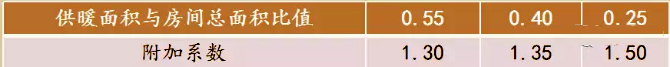 6、局部地面輻射供暖系統熱負荷,可按整個房間全面輻射供暖所算得的熱負荷乘以該區域面積與所在房間面積的比值和下表中所規定附加系數確定。