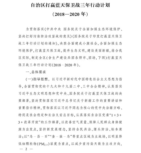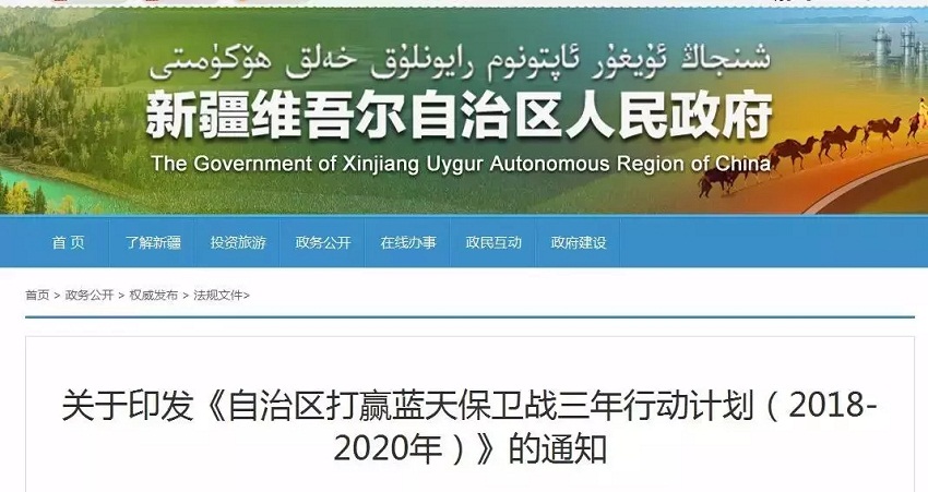 新疆維吾爾自治區(qū)人民政府發(fā)布了關(guān)于印發(fā)《自治區(qū)打贏藍(lán)天保衛(wèi)戰(zhàn)三年行動(dòng)計(jì)劃(2018-2020年)》的通知