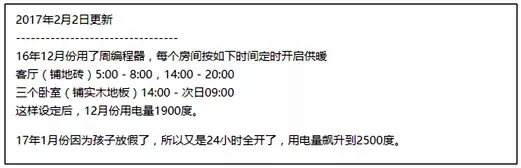 16年12月份每個房間分時開啟供暖。客廳(鋪地磚)5:00 - 8:00,14:00 - 20:00;三個臥室(鋪實木地板),14:00 - 次日09:00。這樣設定后,12月份用電量1900度。