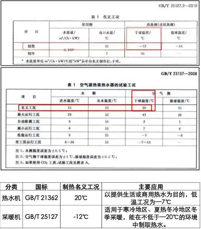 空氣源熱泵熱水器(GB/T 21362)側重于熱水,設計工況干球溫度20℃,進出水溫15-55℃,最高水溫60℃,不適用于寒冷地區、夏熱冬冷地區冬季采暖。