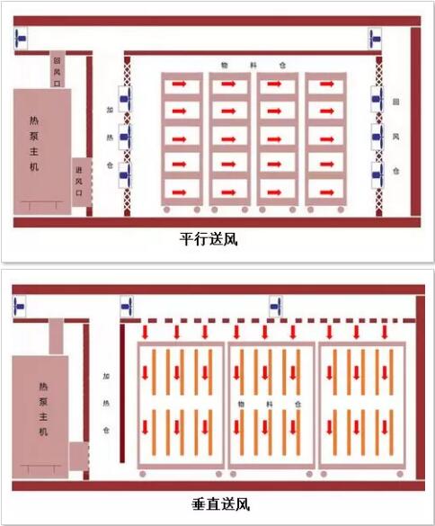 采用適合的送風方式,設計合理的烘干房結構才能順利烘干出產品,否則即使熱泵機組能力再強,也有可能出現物料干燥不均勻,或部分物料無法干燥的情況。