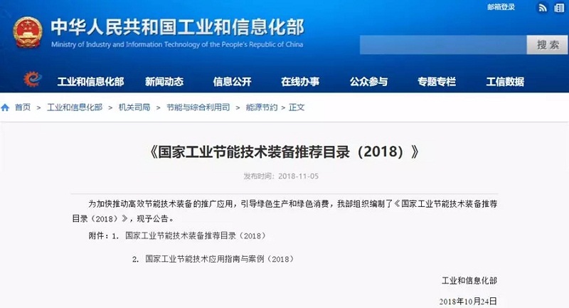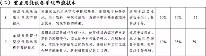 2018年11月5日,工業(yè)和信息化部發(fā)布《國家工業(yè)節(jié)能技術(shù)裝備推薦目錄(2018)》公告,其中“高溫氣源熱泵烘干系統(tǒng)節(jié)能技術(shù)、單機(jī)雙級(jí)螺桿型空氣源熱泵機(jī)組節(jié)能技術(shù)”兩項(xiàng)空氣源熱泵技術(shù)、案例成功入選《國家工業(yè)節(jié)能技術(shù)裝備推薦目錄(2018)》及《國家工業(yè)節(jié)能技術(shù)應(yīng)用指南與案例(2018)》。
