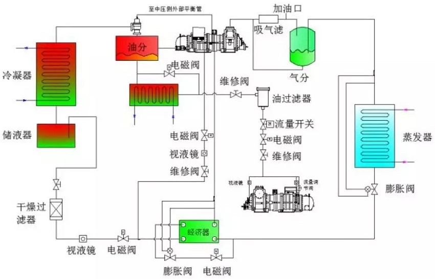 2.技術(shù)原理及工藝單機(jī)雙級(jí)螺桿壓縮超大型空氣源熱泵機(jī)組是一種基于逆卡諾循環(huán)原理建立起來的節(jié)能、環(huán)保、制熱高效、集熱并轉(zhuǎn)移熱量的裝置。采用單機(jī)雙級(jí)螺桿壓縮技術(shù),使壓縮機(jī)內(nèi)容積產(chǎn)生周期性的容積變化,完成制冷劑氣體的吸入、壓縮和排出,實(shí)現(xiàn)不同高低壓級(jí)間的互換,并通過與實(shí)際工況合理搭配排量比,達(dá)到機(jī)組最優(yōu)運(yùn)行狀態(tài)。系統(tǒng)原理圖如下: