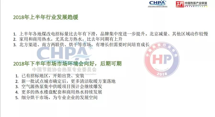 2017年我國(guó)空氣源熱泵供熱產(chǎn)業(yè)取得非常好的成績(jī),但是在2018年上半年行業(yè)發(fā)展趨緩,整機(jī)制造企業(yè)壓力非常大,源于2018年上半年煤改電的招標(biāo)總量與去年相比有所下降,品牌的集中度迅速提高。具體北京地區(qū)冬季清潔取暖工程空氣源熱泵產(chǎn)品市場(chǎng)需求量比去年有所降低,河北、山東、山西等其他區(qū)域工作開(kāi)展比較慢,且市場(chǎng)比較分散,給空氣源熱泵整機(jī)企業(yè)帶來(lái)非常大的壓力。但2018年后半年市場(chǎng)環(huán)境會(huì)向好,市場(chǎng)前景依然可期。尤其是北方地區(qū)清潔取暖新一批試點(diǎn)城市公布之后,更多的清潔取暖方案將落地。此外,空氣源熱泵集中供暖項(xiàng)目在2018年后半年也將迎來(lái)市場(chǎng)旺季,集中供暖市場(chǎng)將為商用低溫空氣源熱泵機(jī)組等產(chǎn)品帶來(lái)市場(chǎng)會(huì)在后半年持續(xù)爆發(fā)。在生活熱水領(lǐng)域,越來(lái)越多的精裝樓盤選擇使用空氣源熱泵產(chǎn)品實(shí)現(xiàn)生活熱水的配套,還有就是細(xì)分的烘干市場(chǎng),如淤泥、煙業(yè)的烘干市場(chǎng)都將為專業(yè)空氣源熱泵企業(yè)提供良好的細(xì)分的發(fā)展空間。