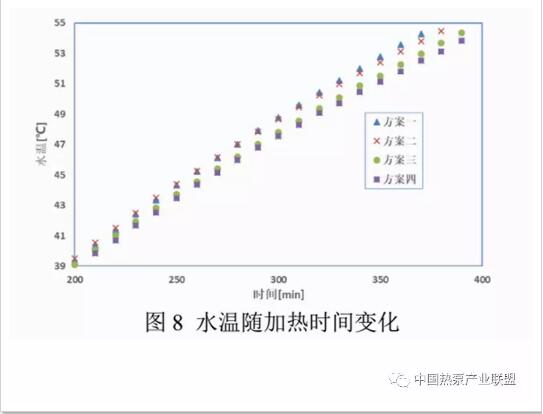 四種方案均是在環境溫度20/15的標況下,將水從15℃加熱到55℃時停止測試。