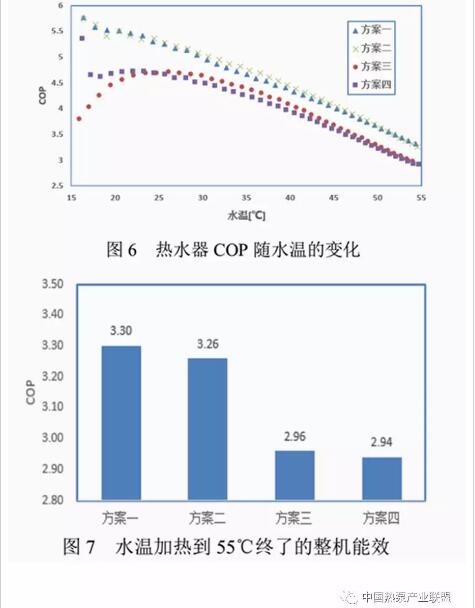 圖6和圖7分別為四組不同方案,總COP隨水溫的變化情況以及水溫從15℃加熱到55℃的整機能效數值。從圖中可以看出,COP隨著水溫的升高不斷降低,主要原因在于,隨著水溫的上升,高低壓壓比增大,壓縮機功耗增加,能力降低,COP從而不斷下降;