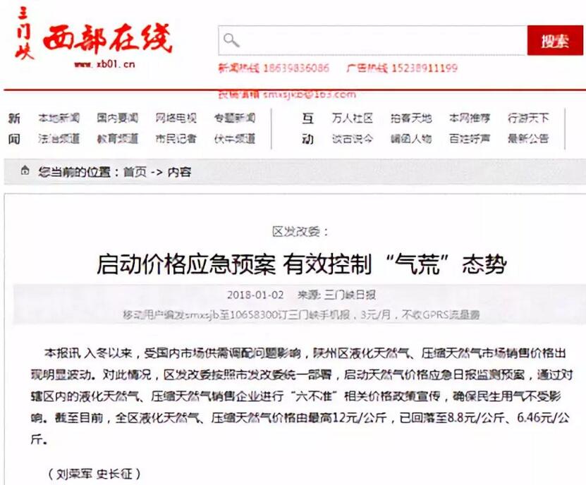 2016年冬季,三門峽鬧氣荒,燃氣價格飆漲,液化最高漲至12元/公斤。2018年1月初,三門峽區發改委不得不啟動價格應急預案,才有效控制氣荒態勢。全區液化天然氣、壓縮天然氣價格由最高12元/公斤,慢慢回落至8.8元/公斤、6.46元/公斤。