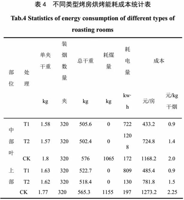 從表4可知,各處理烘烤能耗成本相比,T1能耗成本最低,中部葉和上部葉每千克干煙的成本均為0.9元;對照CK能耗成本最高,由煤和電兩種能源構成,中部葉和上部葉每千克干煙的成本分別為2.0元和2.25元;T2能耗成本居中,中部葉和上部葉每千克干煙的成本分別為1.4元和1.5元。以上結果表明,T1處理的烤房具有明顯的節能效果,比對照CK烤房可節省1.1-1.35元/kg干煙。