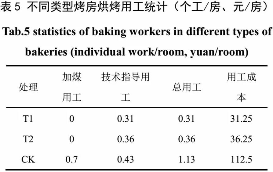 從表5可知,不同處理烘烤用工成本以對照CK最高,為112.5元/房;以處理T1最低,為31.25元/房;處理T2居中,為36.25元。分析比較用工構成,可明顯看出,處理T1和T2與對照CK相比,技術指導用工相差不大;處理T1和T2比對照CK缺少了加煤用工環節,而加煤用工在對照CK總用工量中占有較大比例,因此導致總用工量和成本明顯降低,其中用工成本比對照CK減少了76.25-81.25元/房。處理T2烘烤時間比處理T1長1天,所以用工成本相對較高。