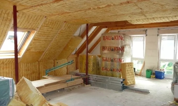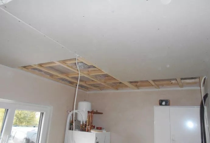設備間的內(nèi)部,天花板的底部,石膏板的釘貼,施工現(xiàn)場