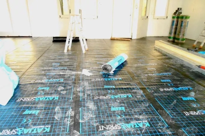圖為地暖地面構造中,最底層的防水隔潮膜的鋪設施工現(xiàn)場