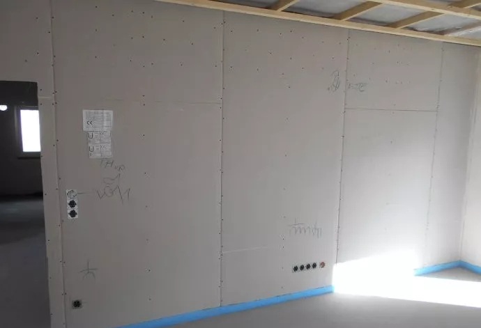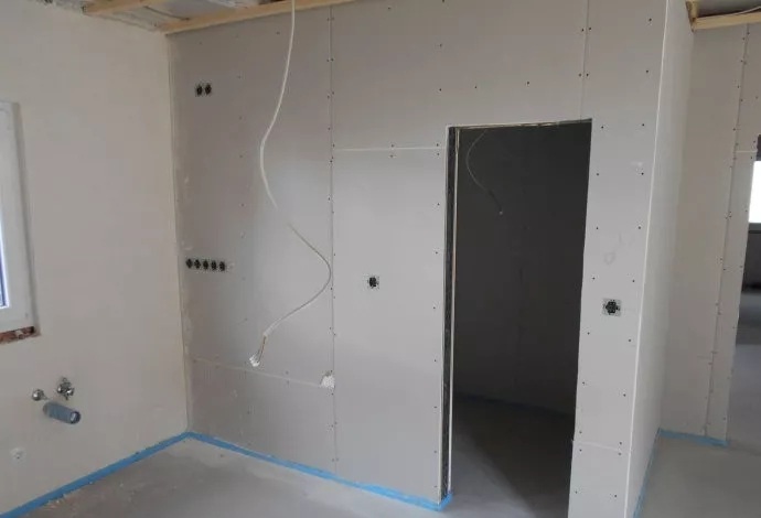 室內(nèi)石膏板墻面,機械噴涂專用防水涂料,裝飾施工現(xiàn)場。