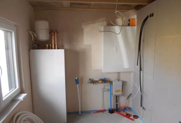 房屋內(nèi)部,設備間,自來水、電力、通訊線纜,以及“空氣源熱泵”系統(tǒng)的室內(nèi)主機,安裝現(xiàn)場,局部特寫。