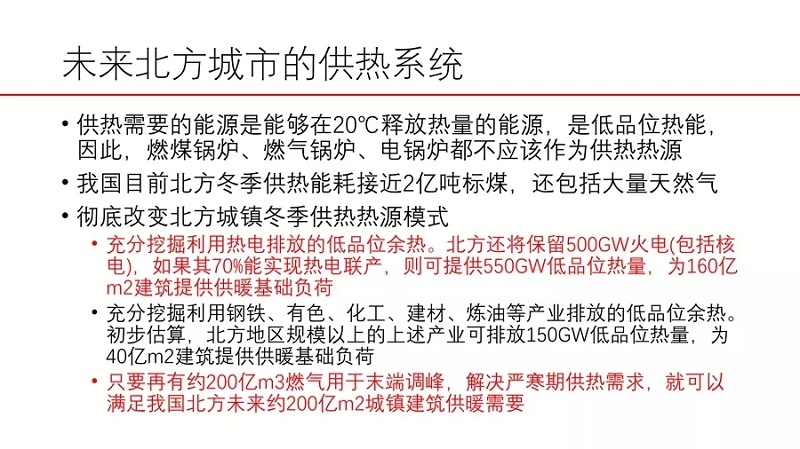 中國節能協會理事長、中國工程院院士江億在中國節能協會舉辦的“2018中國節能與低碳發展論壇”上強調,中國“缺油少氣”的資源狀況使我們很難按照西方的路徑煤改油氣,我國必須發展可再生能源與核能為主的能源供給系統,與發達國家同步。在未來北方城市的供熱系統中,供熱需要的能源是能夠在20℃釋放熱量的能源,是低品位熱能,因此,燃煤鍋爐、燃氣鍋爐、電鍋爐都不應該作為供熱熱源。