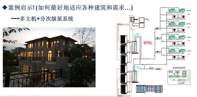 下圖是我們?cè)诤贾莸囊粋(gè)大別墅案例,就采用了多主機(jī)+分次級(jí)泵系統(tǒng),空氣源熱泵可以和末端直接通迅對(duì)接同時(shí)控制對(duì)應(yīng)能力的壓縮機(jī)和次級(jí)泵的輸出,這里面運(yùn)用了很多感應(yīng)的技術(shù),用戶(hù)對(duì)現(xiàn)在這個(gè)系統(tǒng)總體上還是非常滿意的,特別是我們解決了極低負(fù)荷下(如只有兩人在家開(kāi)一個(gè)房間的制冷)時(shí),水泵輸送功耗的問(wèn)題,在大別墅里10%以下的低負(fù)荷運(yùn)行占據(jù)90%以上的時(shí)間比,因此,低負(fù)荷下的能效比對(duì)用戶(hù)而言就非常關(guān)鍵!目前我們的技術(shù)平臺(tái)完全支持個(gè)性化的要求,這是我們智能熱泵能做到的。