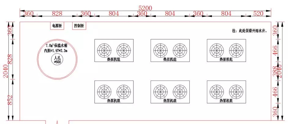 系統三占地面積8m×6.5m,共52m2,共布置4臺機組和1個5.0m3的保溫水箱,機組總制熱量為382kW,分別承擔8、10號樓的供熱負荷。如下圖。