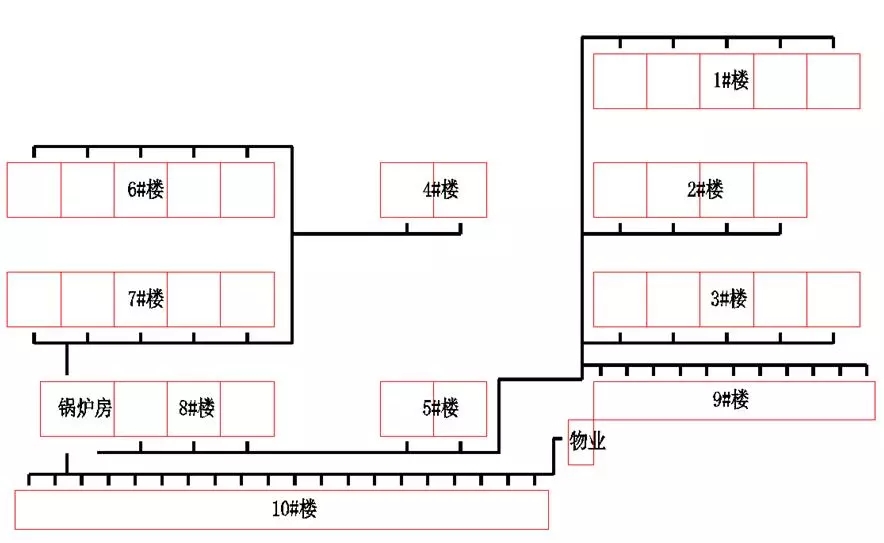 這個案例在陜西,一共有10棟住宅和物業管理,1~8號樓為6層,9~10號樓是1~2層,采暖面積一共42900多平,原先在8號樓東南角有一個燃煤鍋爐房。下圖是鍋爐房原先的管網布置,供暖系統由鍋爐房循環泵經室外管網分別送到各棟樓室內的采暖系統。