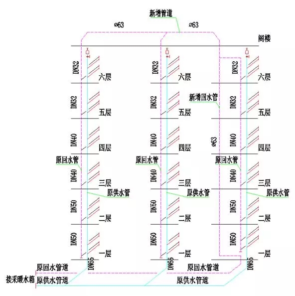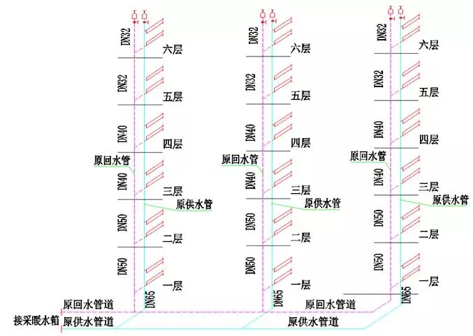 空氣源熱泵室內供暖系統經原室外管網進入每棟住宅,接已有的地暖系統。兩系統圖對比,設計者對系統認為原異程式下供下回可能有問題,所以將原異程式下供下回系統改為現同程式下供上回系統,見改造后的地暖系統圖。