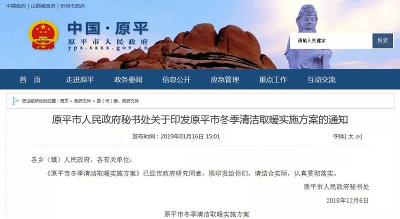 原平市人民政府因地制宜推廣空氣源熱泵電鍋爐天然氣等供暖設施,盡可能利用清潔能源實現清潔取暖